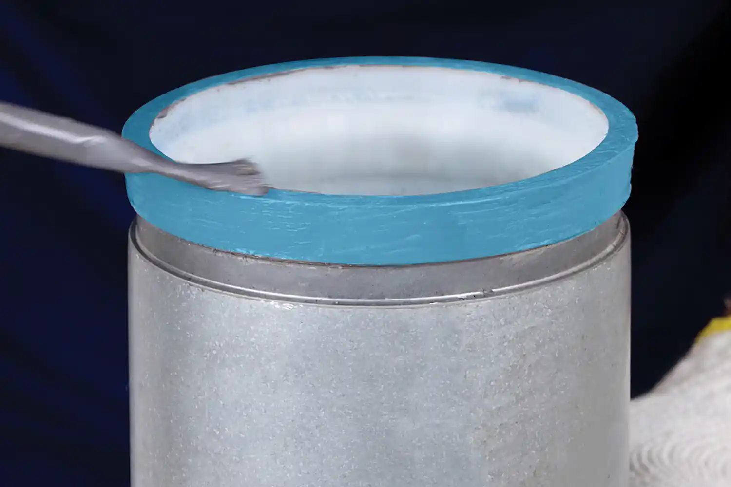 3. รอเฮอร์เมสซีล 55 บริเวณหน้าตัดท่อ และบริเวณผิวท่อด้านข้างทั้งหมดให้แห้งก่อน จากนั้นทาน้ำยาหล่อลื่น Lubricant ที่ขอบยาง EPDM รอบนอกทั้งหมด รวมถึงบริเวณขอบยาง EPDM ที่ต้องสัมผัสกับท่อไซเลอร์ดังรูป (1) เนื่องจากหน้าตัดก่ออาจมีคมของเหล็ก ซึ่งอาจทำให้ยางเกิดเป็นรอยแผลขนแมวเล็กๆ ส่งผลให้อายุการใช้งานยางเสื่อมลง การทา Lubricant จะช่วยยืดอายุการใช้งานของยางให้ยาวนานขึ้น และป้องกันไม่ให้เกิดการรั่วซึม